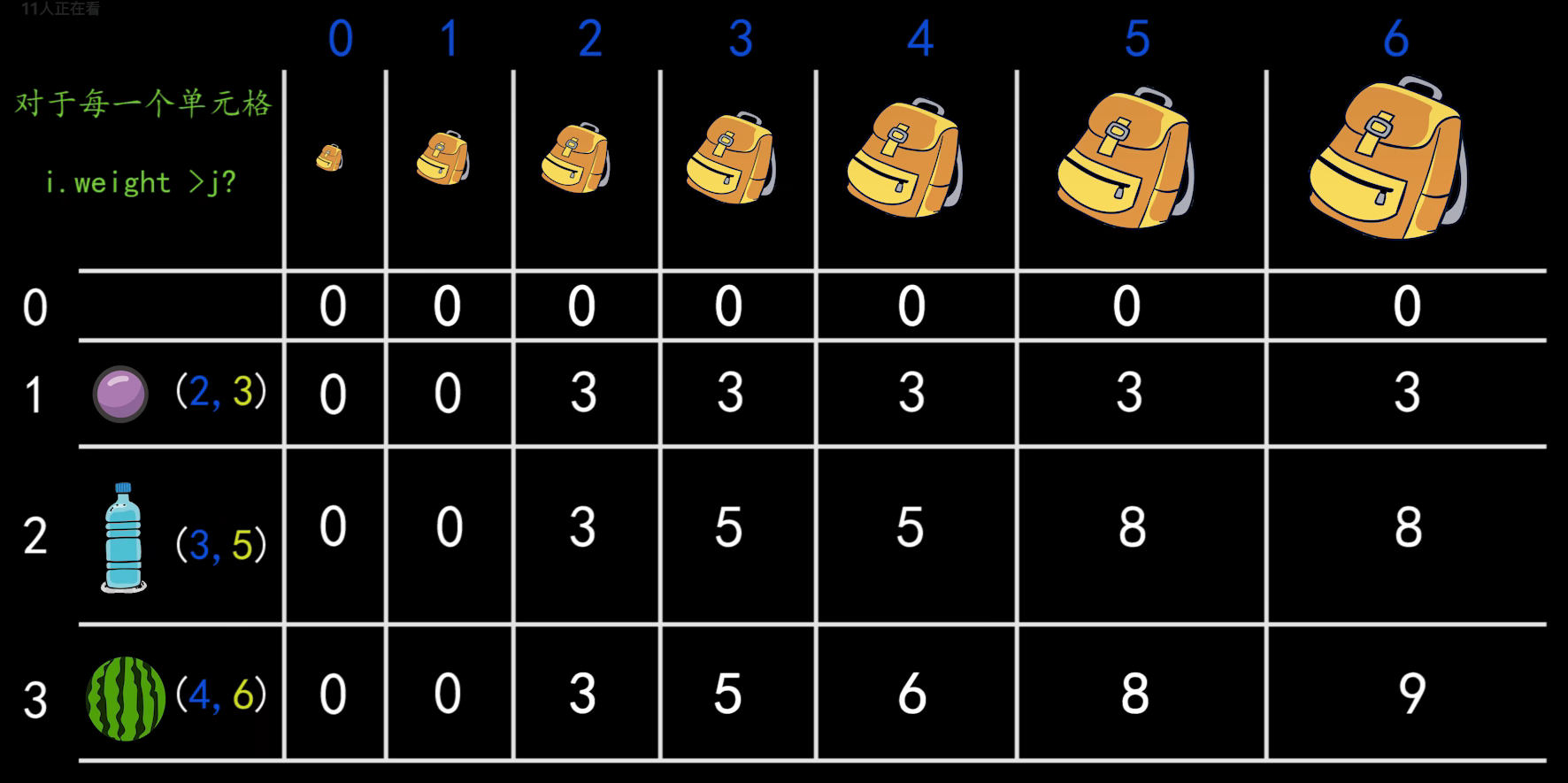 01背包问题 葡萄重量为2,价值为3;矿泉水重量为3价值为5;西瓜重量为4,价值为6。背包容量为6考虑如何填充背包使价值最大。不可以重复装同一物品。 在这个判断过程中,就是在当前行判断能否装下这个物品,并于同列上一行进行比较,判断取那个值作为当前格子的最优解。判断最优解的过程就是状态转移过程。